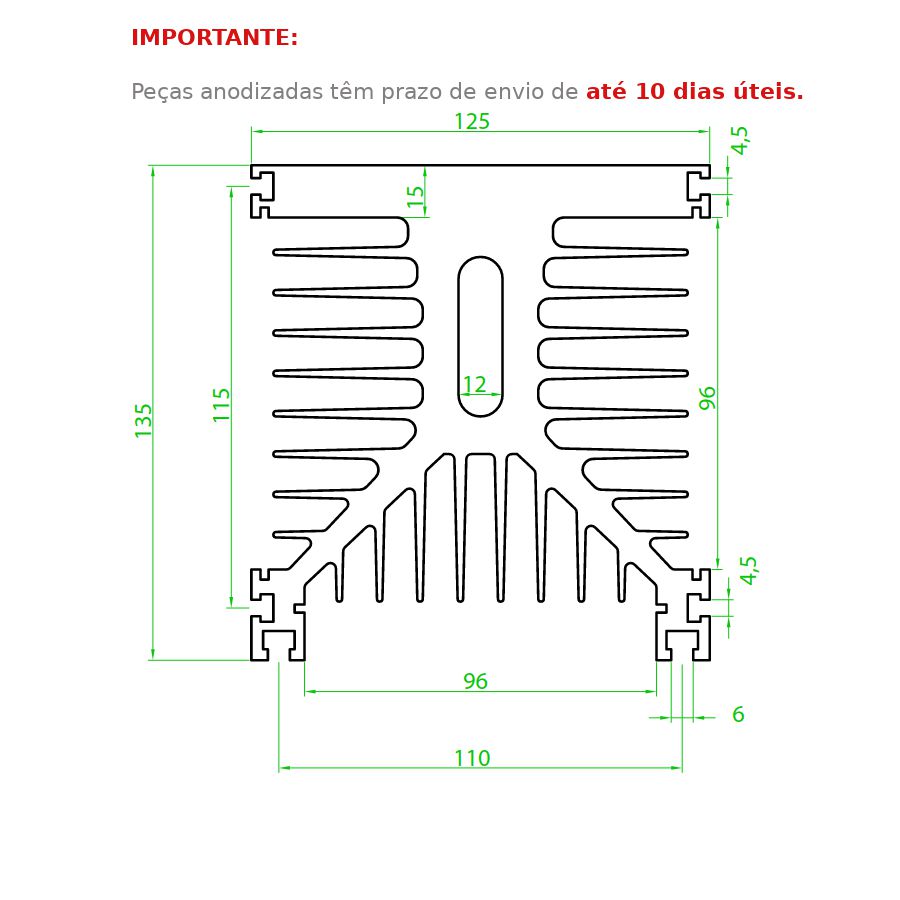 Com grande área e elevada massa, este dissipador é um dos mais utilizados em motagens que necessitam dissipação de grandes potências. O dissipador HS 125135L possui uma espessa base onde são fixados os componentes eletrônicos que precisam ser refrigerados.